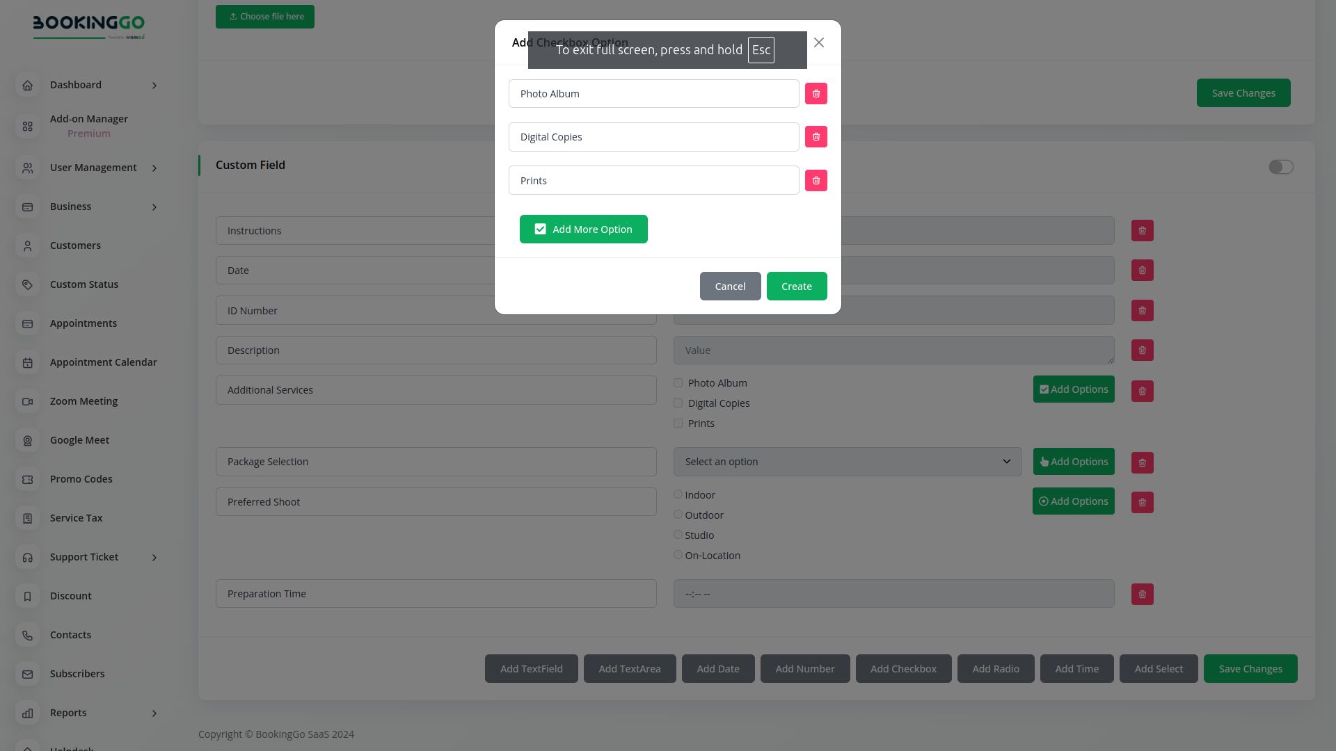 To leverage the capabilities of this module, you first need to ensure that the Additional Custom Field button is enabled in your BookingGo SAAS settings.Without this, you won’t be able to add any custom fields to your forms. The process is straightforward and typically involves navigating to the settings menu and toggling the button to activate the module, making it ready for further customization.